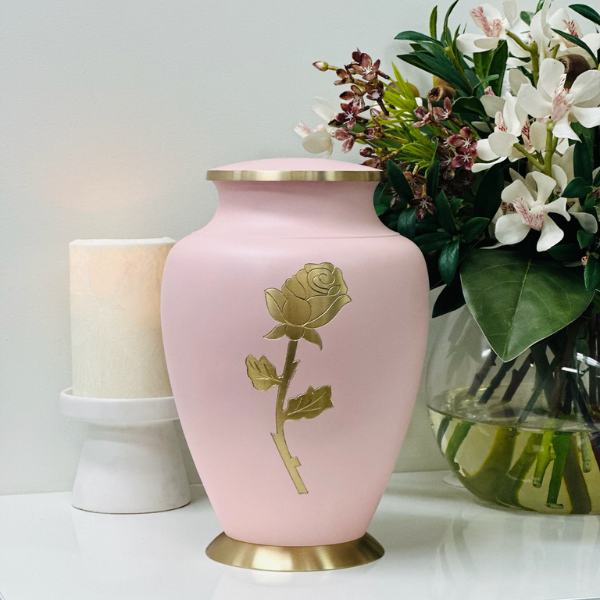 The Aria Rose Urn is a soft pastel pink with a beautiful single gold rose.