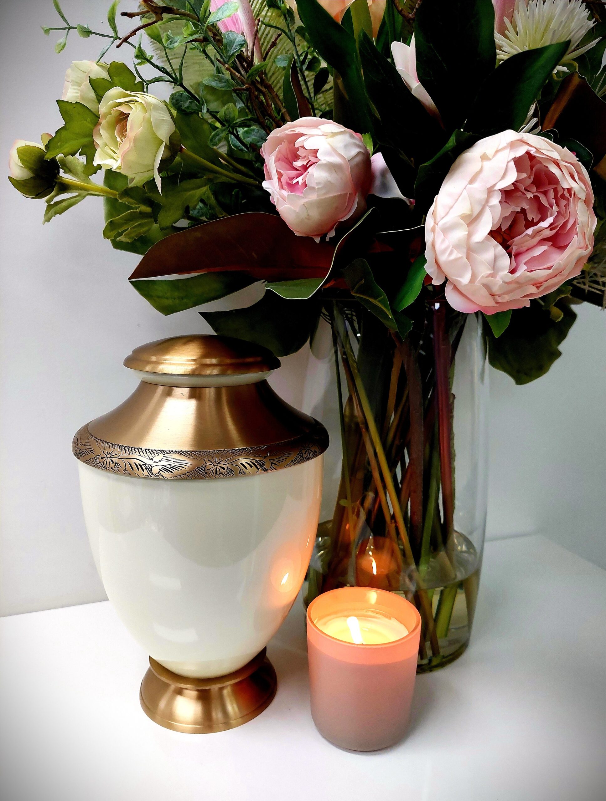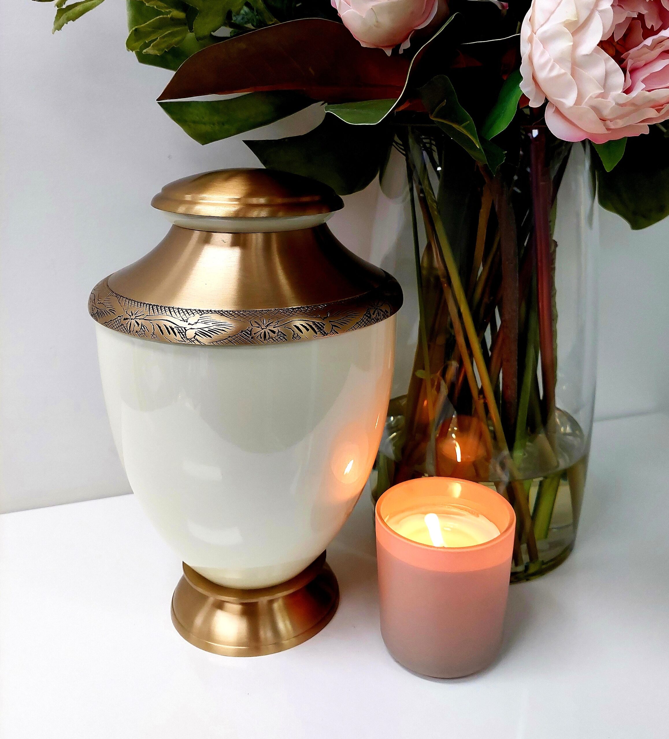 The Artisan Pearl large urn is stylish and elegant. Traditional in shaped, it has a glossy pearl body with brass finished base and top.