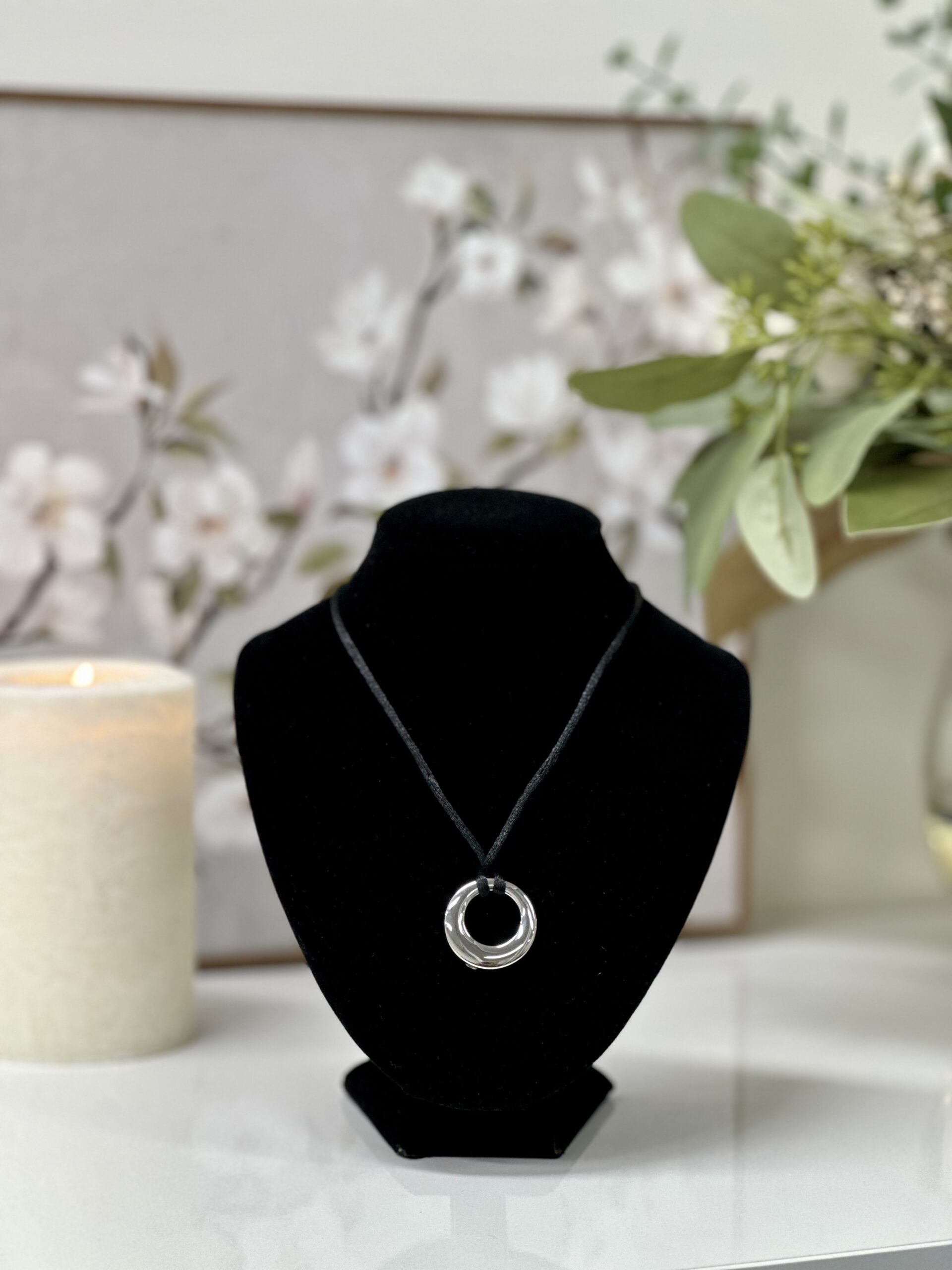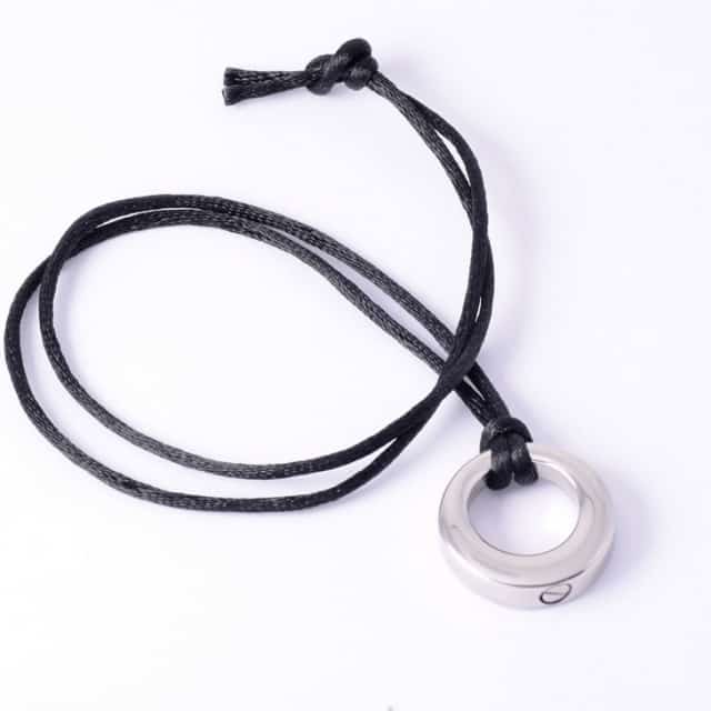 This simple pendant design is in the shape of a ring. Included is a black cord, rather than a steel chain.