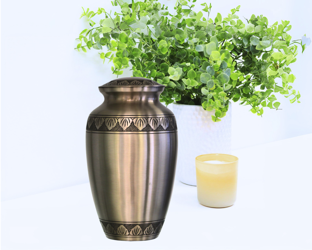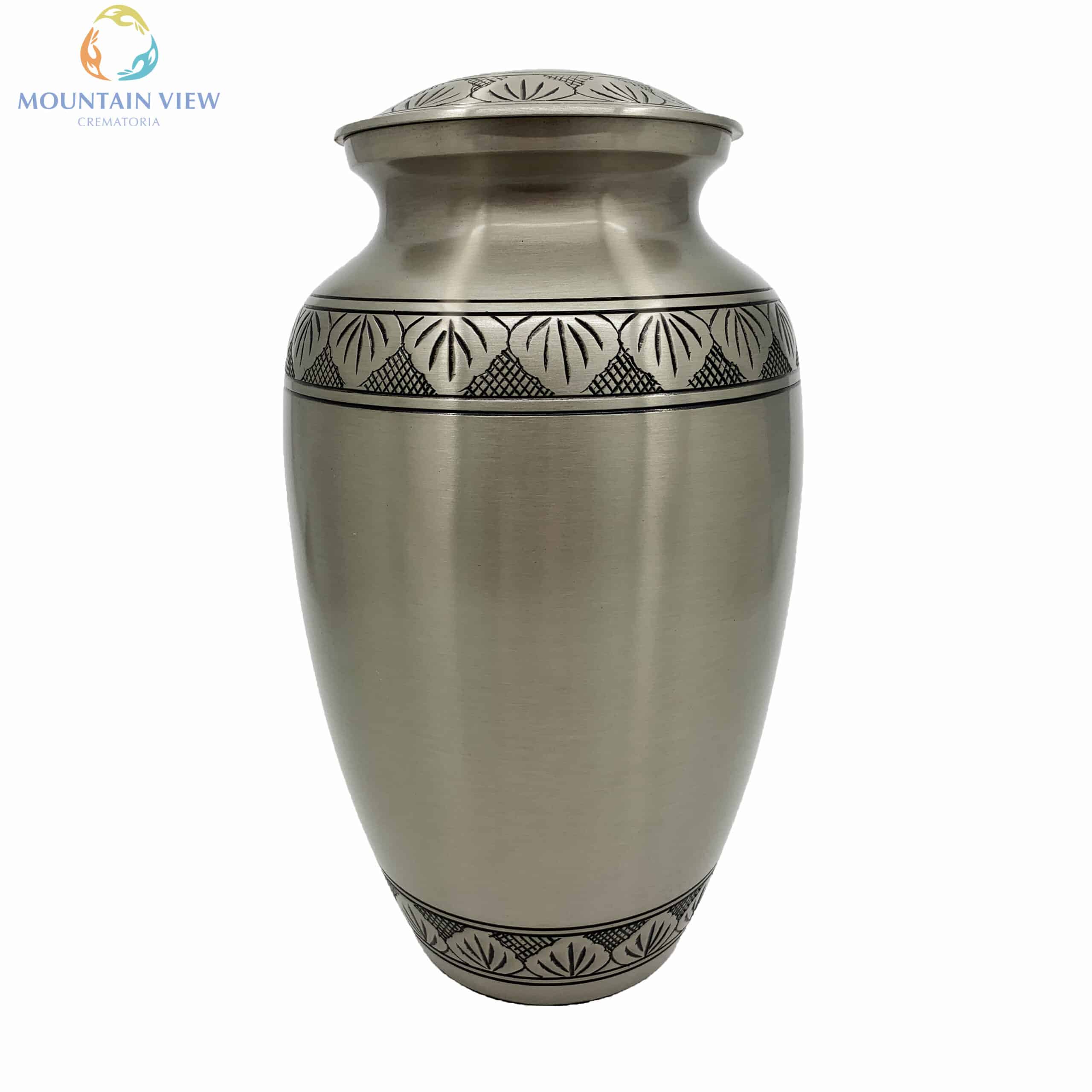 This large urn is made out of sturdy and durable brass, with a silver/pewter finish. Decorative patterns circle the base, shoulder, and the top of the urn. The design is etched into the brass urn and finished with black paint.