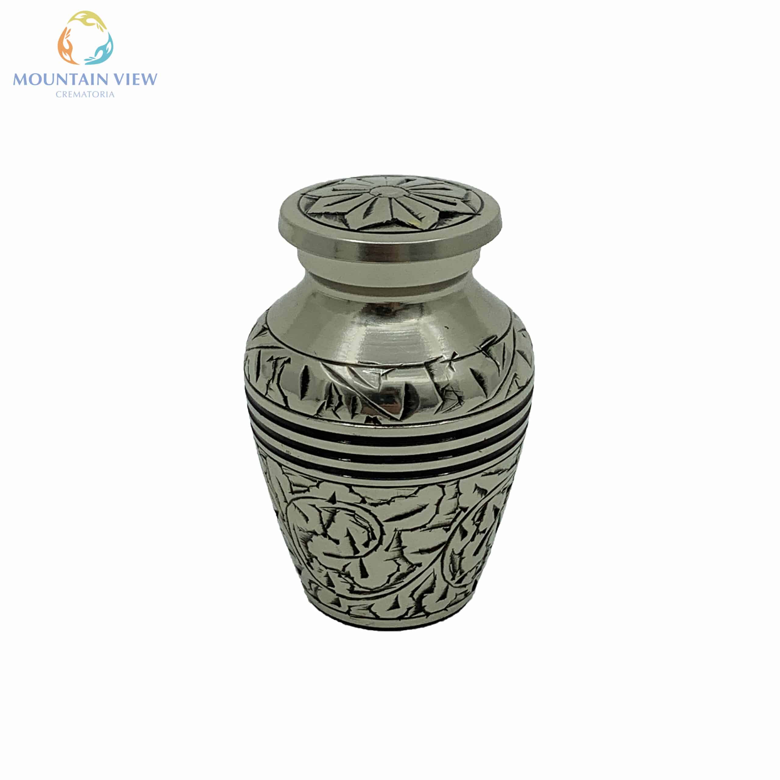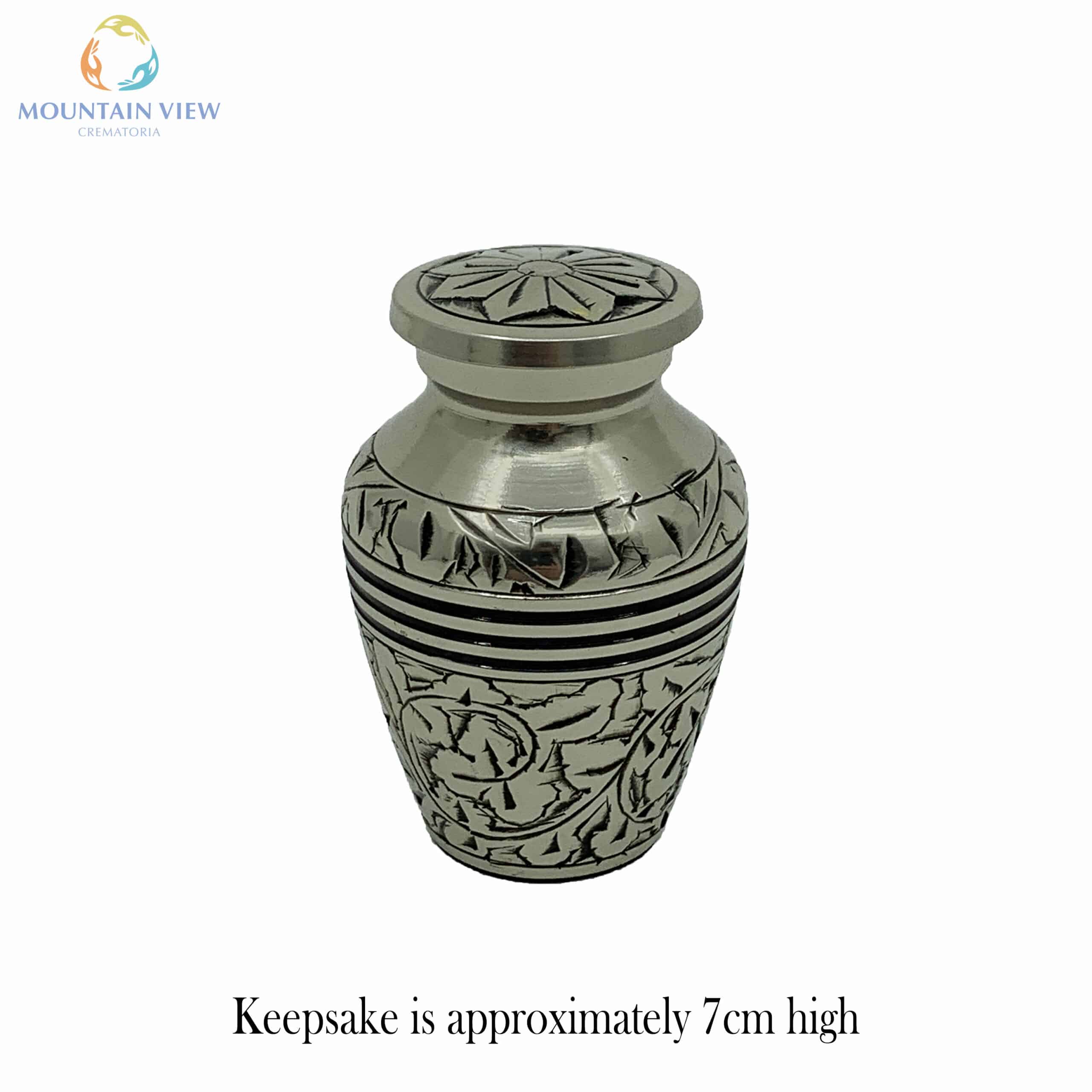 A small keepsake urn, decorated in extensive, etched patterns. Finished in silver, with the etchings finished in black paint.