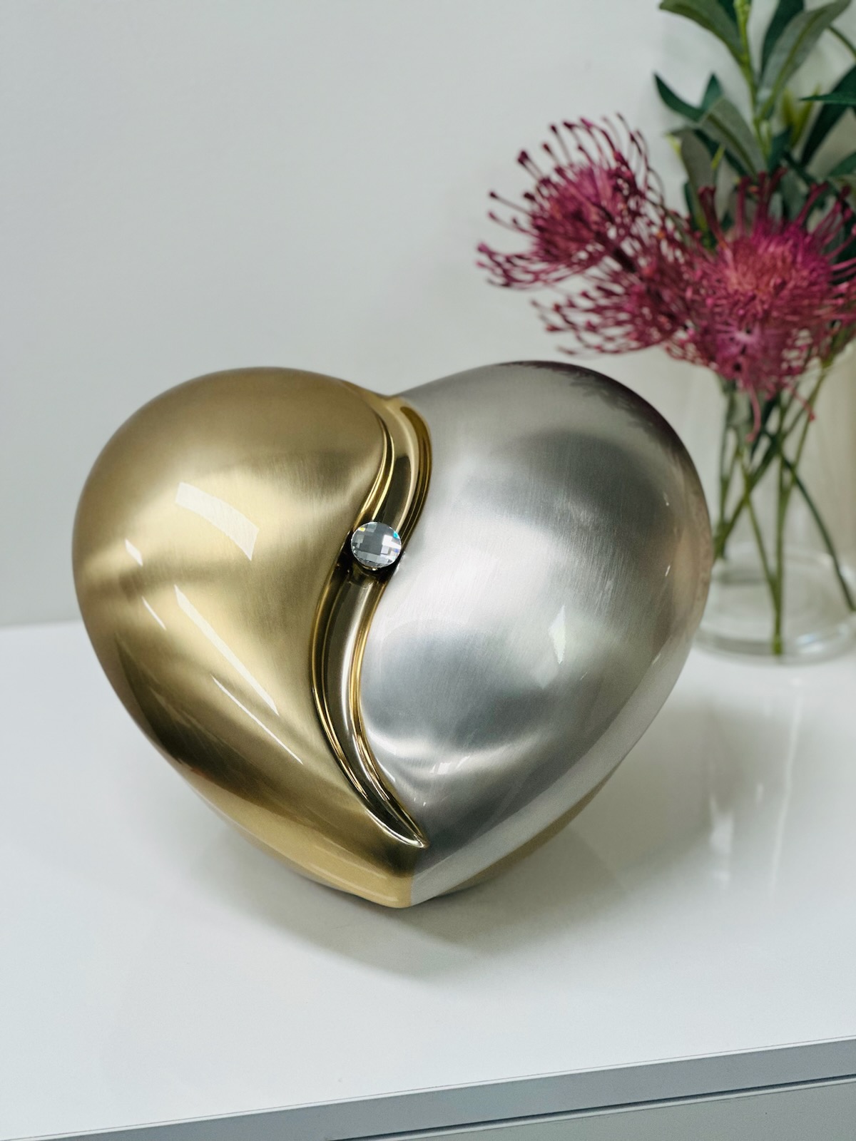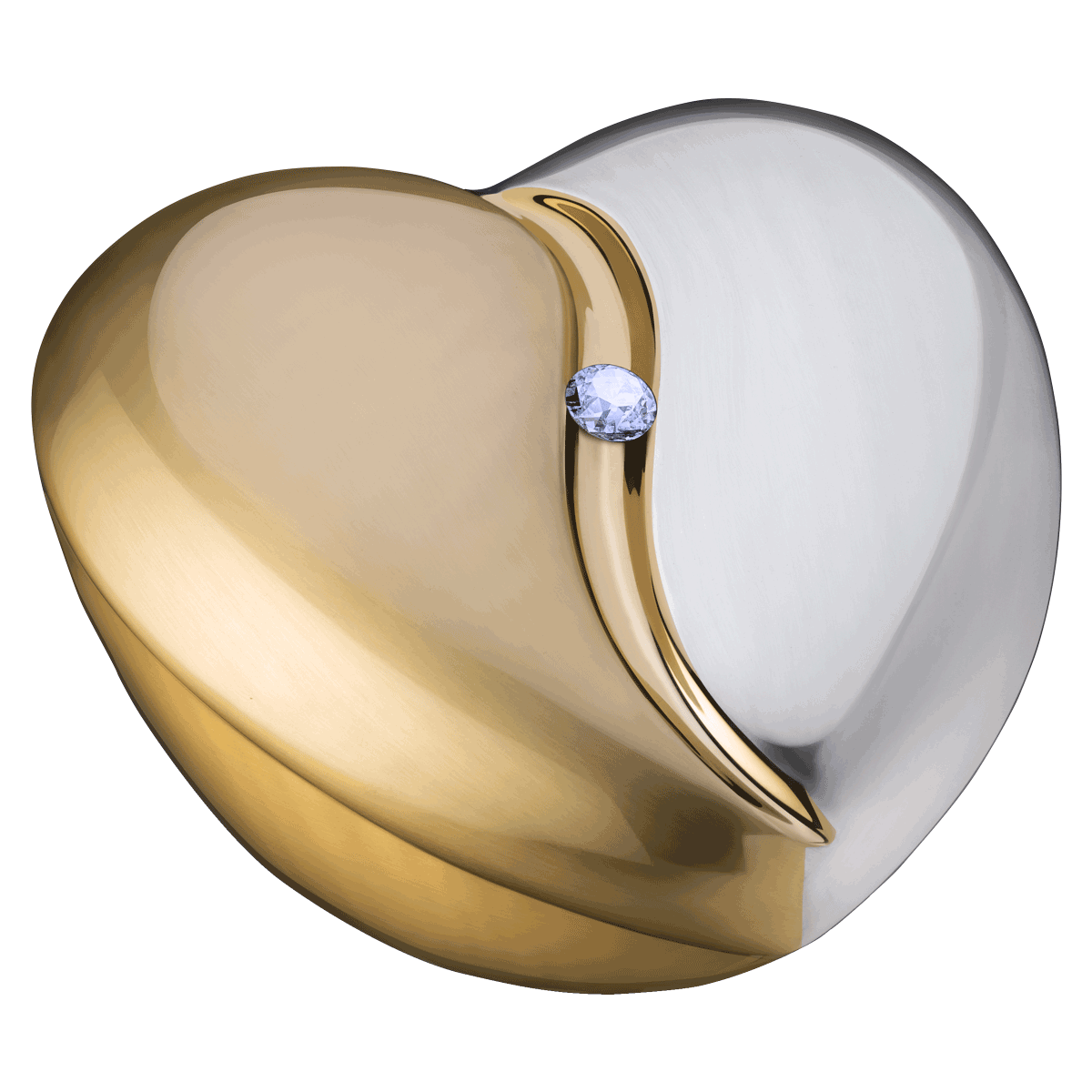 The Heartfelt Brush Gold Large Urn is a beautiful, sculptured heart made of brass with an inlaid crystal.