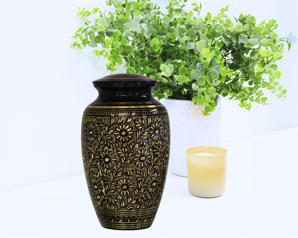 The Indian Range – Radiance Adult urn is a beautifully etched, brass urn. Each urn is hand crafted and some variations to the image shown may occur.