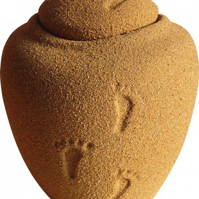 Natural sandy texture with foot prints to match, this urn is shaped traditionally.