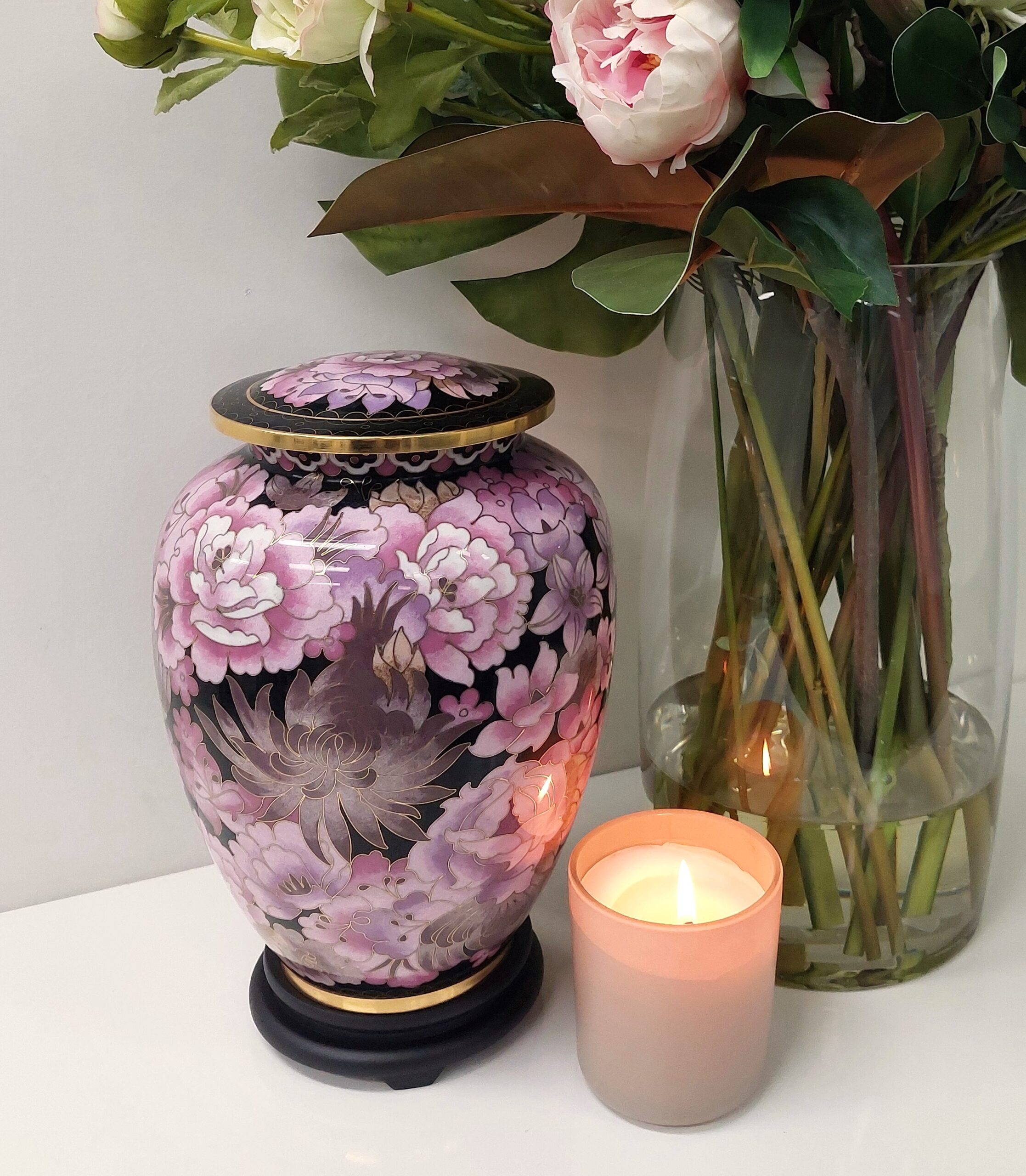 The Pink Floral Cloisonne Adult Urn is individually hand painted and comes complete with a black wooden stand.