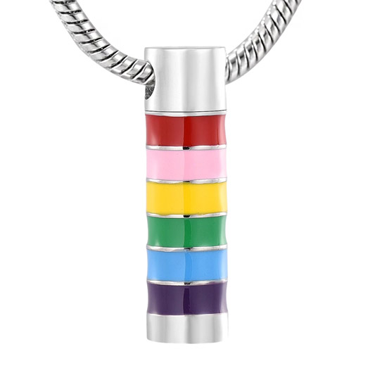 The Rainbow Cylinder Pendant is made of stainless steel and designed with the purpose of holding a small memento of cremation ash.