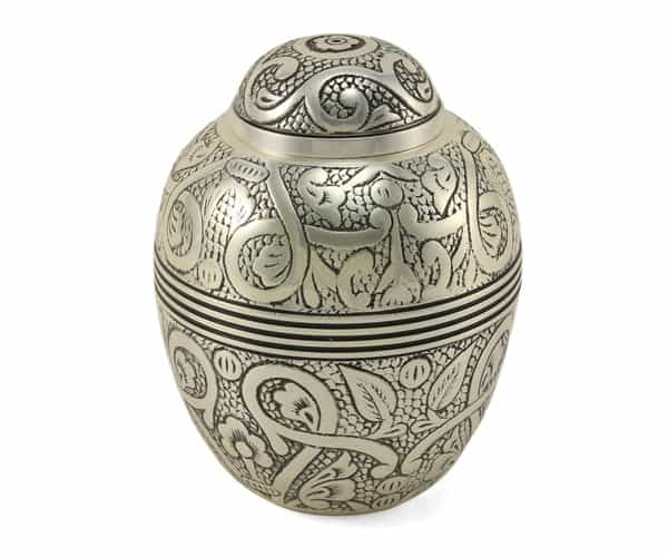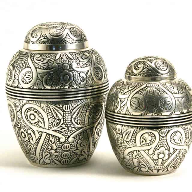 The Silver Embossed Extra Small Urn is designed to accommodate a portion of cremains. It’s intricate embossed detail is handmade, the depth of detial will vary from urn to urn.